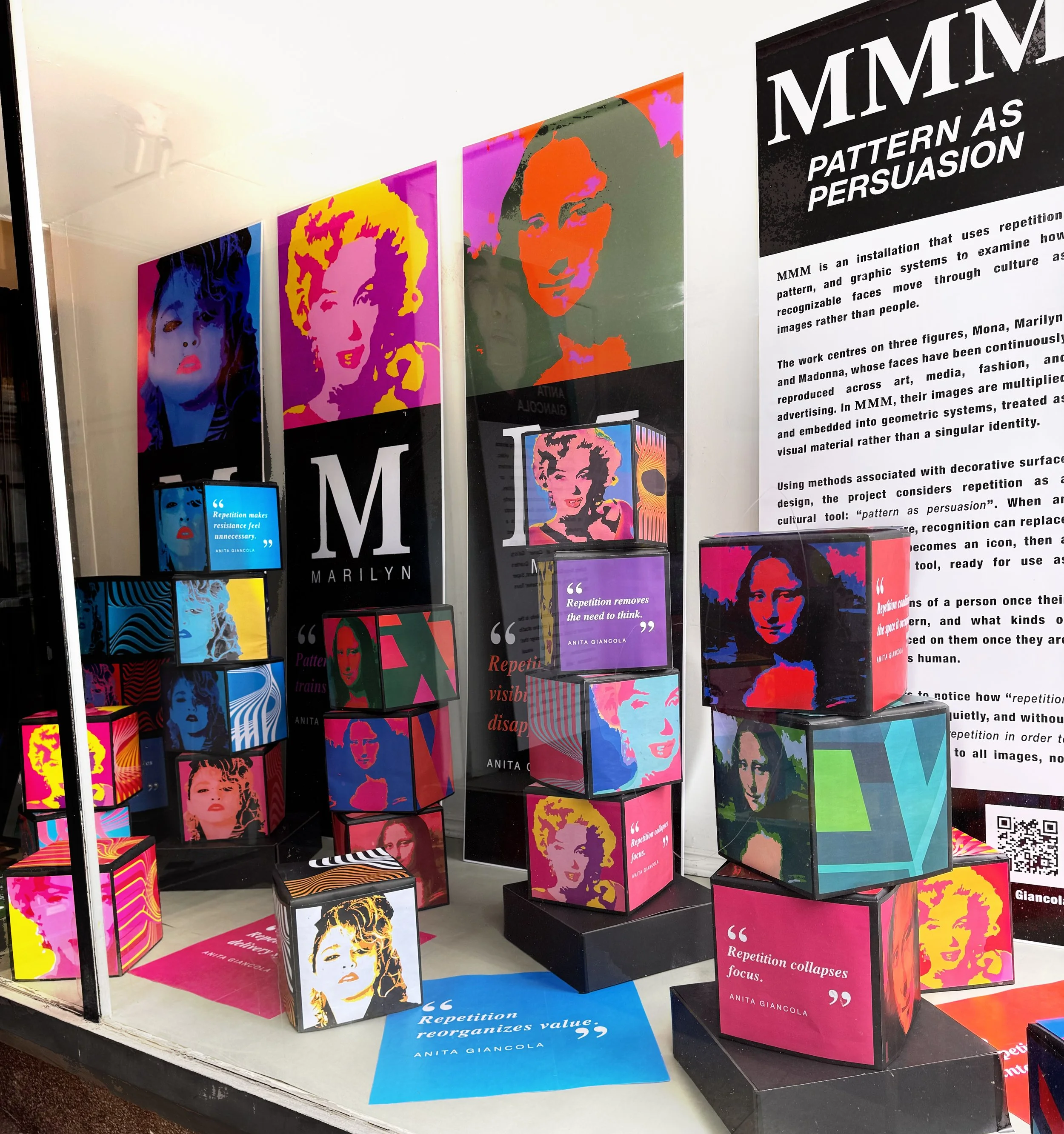 The work centres on three figures, Mona, Marilyn, and Madonna, whose faces have been continuously reproduced across art, media, fashion, and advertising. In MMM, their images are multiplied and embedded into geometric systems, treated as visual material rather than a singular identity.